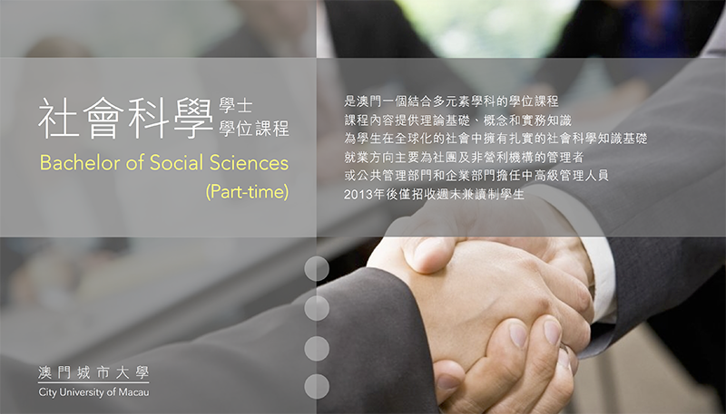 The Bachelor in Social Science is the first multi-disciplinary degree program in Macau. It provides a solid grounding in theories, concepts and working tools in social sciences essential for success in the globalized society. Course curriculum derives from topics that are debated by scholars that allow students to explore from different perspectives, and to enhance students’ competence in academic writing, critical thinking and analytical skills for career advancement or further study at the graduate level. The core design of this program is centered on the three disciplines of Psychology, Sociology and Political Science. |