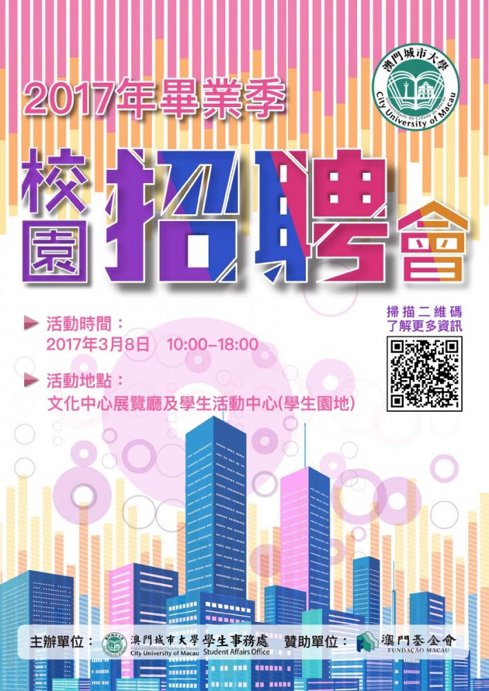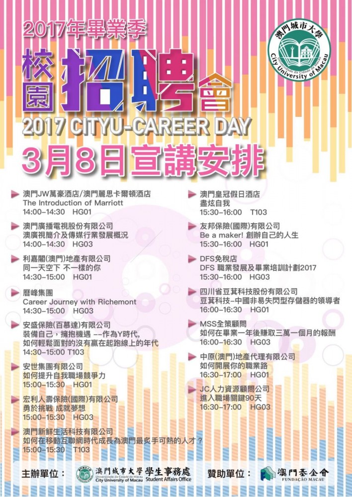 2017年畢業季校園招聘會將於2017年3月8日10:00-18:00(星期三)舉辦,地點為文化中心展覽廳以及學生活動中心(學生園地)。本次招聘會將有40家公司來校參與,提供各類職位供各位選擇!當日14:30-17:00將有15家公司作招聘宣講,分別位於何賢會議中心及T103室,歡迎大家到場咨詢!詳細信息請點擊https://sao.cityu.edu.mo/page-81。