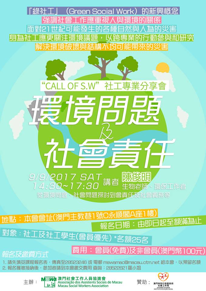 澳門城市大學人文社會科學學院舉辦社會工作課程學生早前參與由澳門社會工作人員協進會舉辦之“CALL OF S.W社工專業分享會—環境問題及社會責任”。活動邀請到講者陳俊明,與參與者從環境問題、社會問題探討社會義務。